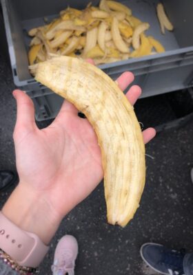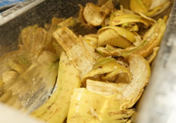 2/ Bóc chuối tự động nhanh chóng. Việc bóc từng quả được thực hiện ngay lập tức đảm bảo tách vỏ và cùi rõ ràng.